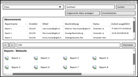 - Navigation und Verwaltung der Reports soll mit bestehender Funktionalität gelöst werden