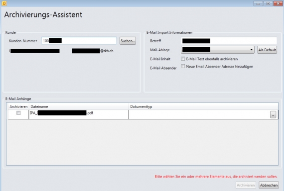 A1: Im Archivierungsassistenten mit einen Kontrollkästchen ergänzen, mit welchem der Kundenberater eine Zuordnung der E-Mail Absender Adresse zum Kunden veranlassen kann.