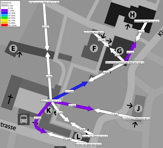 Mit Hilfe von einer ""Weathermap"" sollten mehrere Übersichtskarten erstellt werden, welche den Netzwerkverkehr zwischen und in den Gebäuden farblich darstellen.