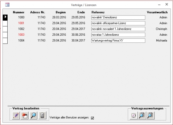 Ziel war es, das in diesem neuen Modul Verträge und Lizenzen erfasst, bearbeitet und verschiedenen Mitarbeitern zugeteilt werden. Durch setzen eines Erinnerungsdatums wird der verantwortliche Benutzer zu gegebener Zeit mit einem Pop-Up daran erinnert, dass das Ende eines Vertrages näher rückt.