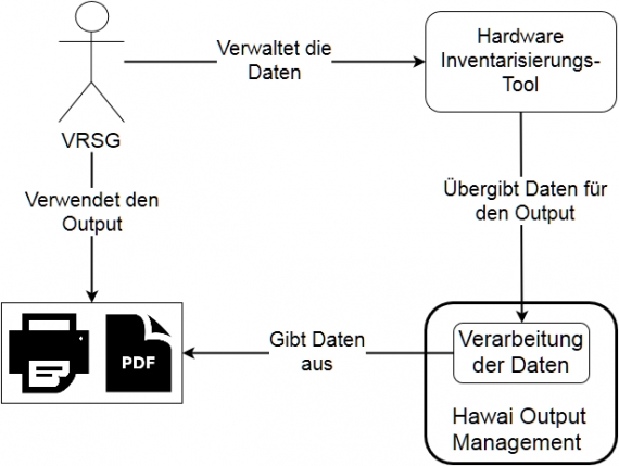Das Umfeld des Moduls sind Hawai 2.0, das Filesystem und ein Drucker. Die Applikation Hawai 2.0 greift über die Schnittstelle auf die Funktionen des Hawai Output Managements zu. Das Output Management speichert ein PDF-File im Filesystem oder gibt den Druck an den Drucker weiter.