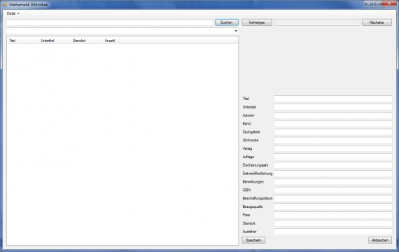 Die Fachschaftsbibliothek Mathematik wird zur Verwaltung der Mathematikbücher verwendet. Das heutige Programm ist veraltet (FileMaker-Datenbank) und soll deshalb im Rahmen dieser Arbeit durch ein neues Programm ersetzt werden. Vor der IPA wurden die Daten aus dem alten Programm als Excel-Datei exportiert. Diese Excel-Datei soll nun in eine csv-Datei umgewandelt werden, die anschliessend in das neu erstellte Programm importiert werden kann. Der Hauptteil der Arbeit besteht in der Programmerstellung, gemäss Vorgaben des Fachverantwortlichen. Ausserdem sollte für jeden Datensatz nach Möglichkeit ein Bild hinzugefügt werden.
