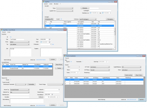 Die Applikation ist eine Terminverwaltung der Lagertests von Produkten. Das heisst man kann einen übergeordneten Lagertest erfassen und ihm Grundwerte wie Startdatum oder Ziel der Testreihe angeben. Diesem Lagertestkopf, werden einzelne Produkte angehängt. Das Muster enthält ebenfalls Parameter, wie Hersteller oder Haltbarkeit.