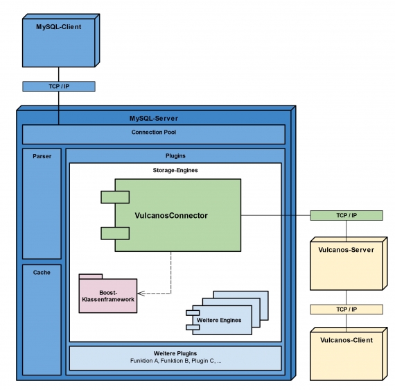 Die Grafik zeigt die Softwarearchitektur des MySQL-Servers. Es sind die internen Komponenten des Servers wie der Cache, der Parser, der Connection-Pool und die Plugins ersichtlich. Im Plugin-Container ist der entwickelte Prototyp ""VulcanosConnector"" enthalten, welcher eine externe Softwarkomponente Benutzt, das Klassenframework Boost. Zusätzlich ist ein MySQL-Client abgebildet, welcher eine Verbindung über den Connection-Pool aufbaut. Ausserdem ist neben dem Server des firmeninternen Datenbanksystems Vulcanos und ein zugehöriger Client ersichtlich, welche über ein Netzwerkprotokoll eine Verbindung zum entwickelten Plugin herstellt.