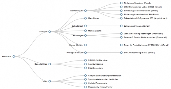 Dynamics CRM besteht aus einem Datenmodell, welches zahlreiche Entitäten, wie Firmen, Verkaufschancen, Termine oder auch Rechnungen und Verträge enthält. Momentan werden Verknüpfungen zwischen solchen Entitäten in Form von Tabellen oder Felder abgebildet. Mehrfach wünschen sich Kunden, diese Verbindungen visuell, in Form eines Diagramms darstellen zu lassen.