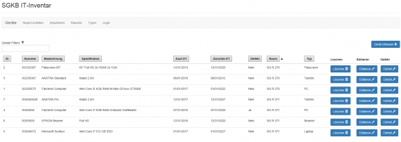 Als Admin können Geräte, Typen und Räume verwaltet werden. Verwalten meint erstellen, editieren und löschen. Die Hauptfunktionalität ist das Verwalten der Geräte. Beim Erfassen eines Geräts muss jenes einem bereits erstellten Raum, sowie einem erstellten Typ zugeteilt werden. Die Webapplikation bietet die Möglichkeit Daten im CSV-Format zu Importieren oder zu Exportieren.