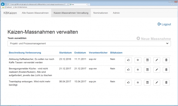 Das vorhandene Excel-Sheet, welches zur Verwaltung der Kaizen-Massnahmen dient, soll durch eine gemeinsam und parallel nutzbare Webapplikation abgelöst werden. Zudem soll man mit dem neuen Tool umgesetzte Ideen und Massnahmen empfehlen und nominieren können.