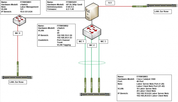Für das Netzwerk wurden zwei VLANs definiert. Beide VLANs wurden in der Netzklasse B realisiert. Das eine VLAN ist ein gewöhnliches 24 Bit Netzwerk. Das andere ist ein Supernetz, welches 23 Bit gross ist. Damit die beiden VLANS miteinander kommunizieren können, gehen sie über einen gemein-samen vSwitch auf einen physischen Cisco Switch. Da beide VLANs auf das gleiche Kabel gehen, muss auf dem vSwitch VLAN Tagging eingerichtet werden. Auf dem Cisco Switch wurde dafür ein Trunk definiert.
