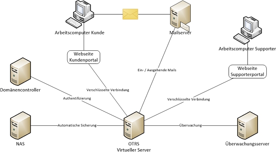 Auf dem Server wurde das Ticketsystem OTRS installiert und als Testumgebung konfiguriert. Dafür wurde das Login so umgestellt, dass sich die Benutzer mit ihrem Windows Benutzernamen und Passwort anmelden können. Damit das Ticketsystem testweise auch in produktiver Umgebung benutzt werden kann, wurde ein Teil der Struktur des bestehenden Systems abgebildet. Zusätzlich wurden Benachrichtigungen über Tickets aktiviert und das Aussehen der Oberfläche angepasst. Später wurde eine automatische Sicherung und Überwachung des Servers eingerichtet.