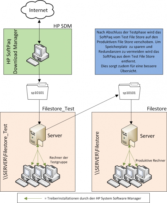 Die Evaluation konnte aufzeigen, dass die neue Lösung eine äusserst Sinnvolle Ergänzung zur momentanen Umgebung darstellen würde. Das Tool wurde mit dem HP SoftPaq Download Manager welcher ein optimales Zusammenspiel ermöglicht, erfolgreich in die jetzige Umgebung eingebunden. Der anschliessende Test ergab, dass alle MUSS-Anforderungen mit der neuen Lösung abgedeckt werden konnten. Der ""HP SoftPaq Download Manager"" (kurz: HP SDM) wird verwendet um die jeweiligen Treiber herunterzuladen und auf dem File Store zu platzieren. Die Anschliessende Installation wird dann durch den HP System Software Manager (kurz: HP SSM) durchgeführt.
