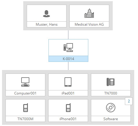 Um die Nutzung der Hard-/Software zu verwalten, können in TOPdesk sogenannte Konfigurationen erstellt werden. Diesen Konfigurationen können einerseits ein Benutzer und andererseits mehrere Geräte und Software zugeordnet werden. So entsteht mit jeder Konfiguration eine Kombination von Geräten und Software, welche dann dem entsprechenden Benutzer zugewiesen oder bei einem Wechsel weiteregegeben werden können. Im obigen Bild ist eine grafische Übersicht einer solchen Konfiguration zu sehen.